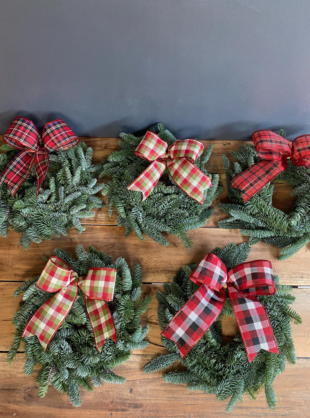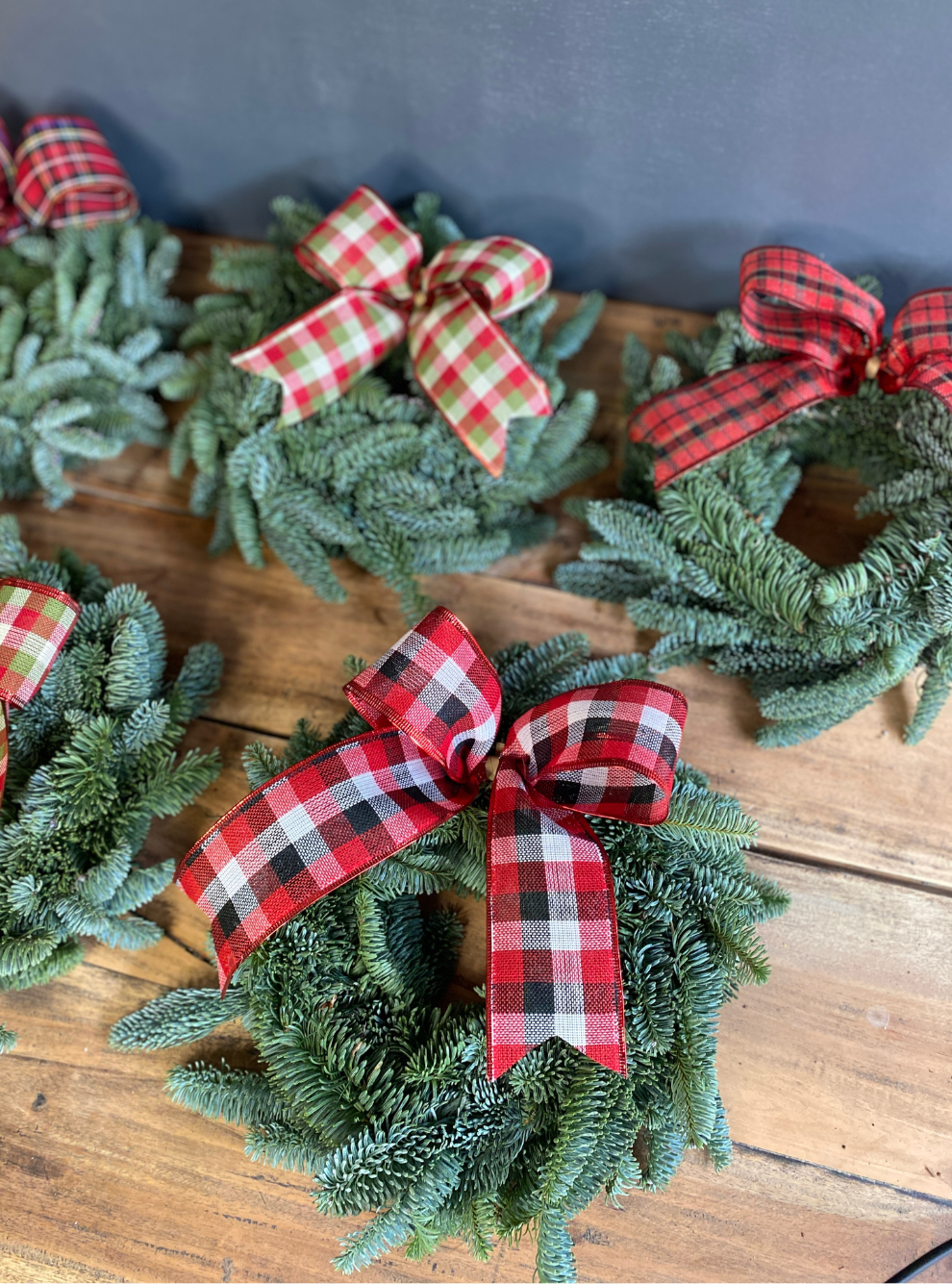 Mini corona de abeto y lazo de cuadros.