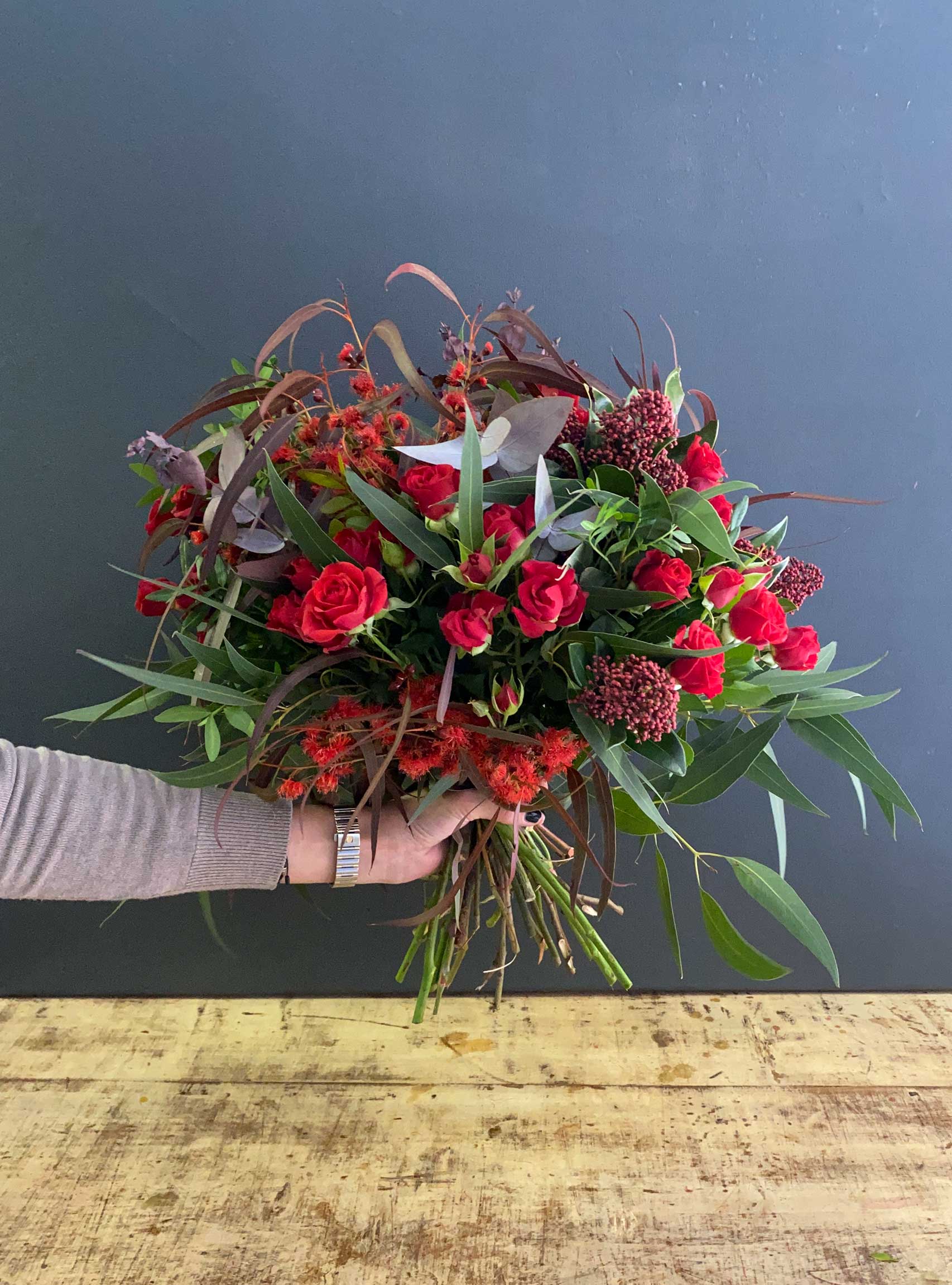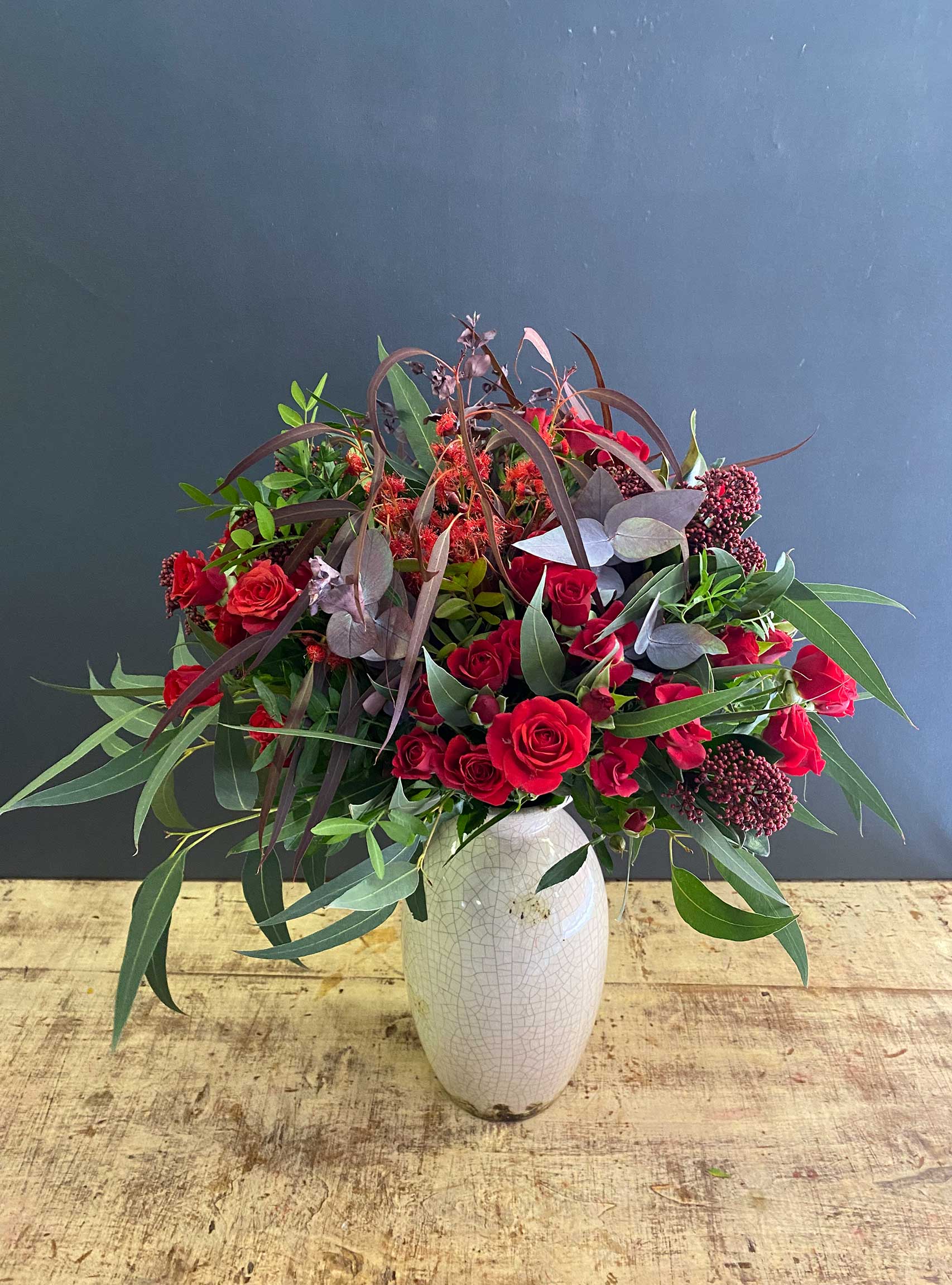 Rosas rojas ramificadas y eucalipto.